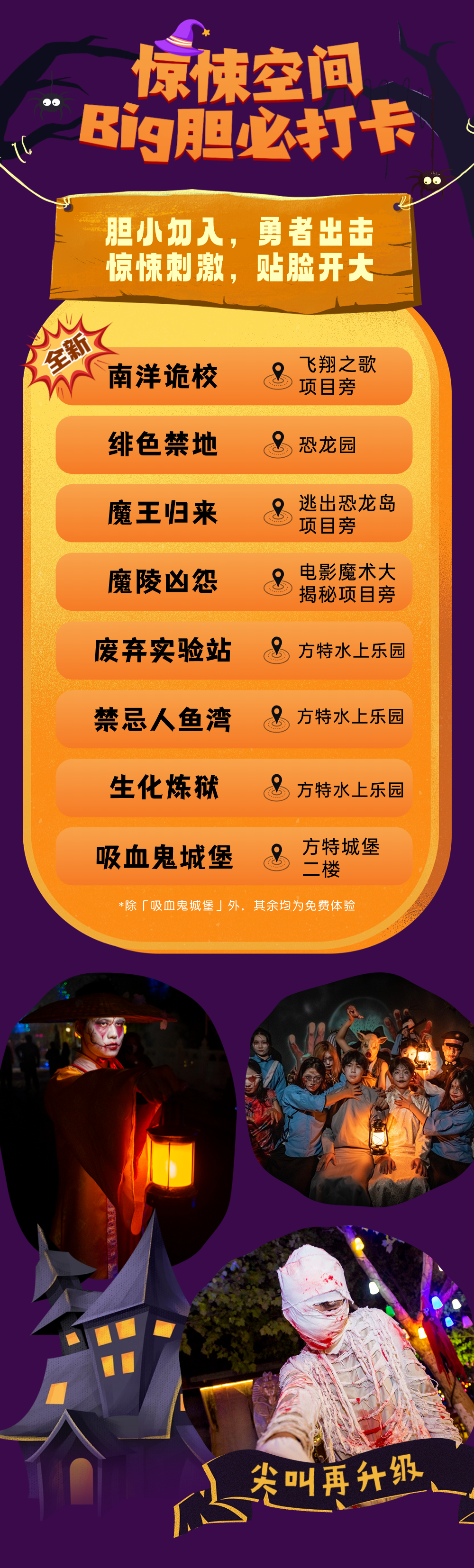 ★惊险之旅:高空飞翔→大摆锤→海盗船→UFO→空中飞舞→极地快车→飞越极限→暴风眼→唐古拉雪山→逃出恐龙岛→恐龙危机;